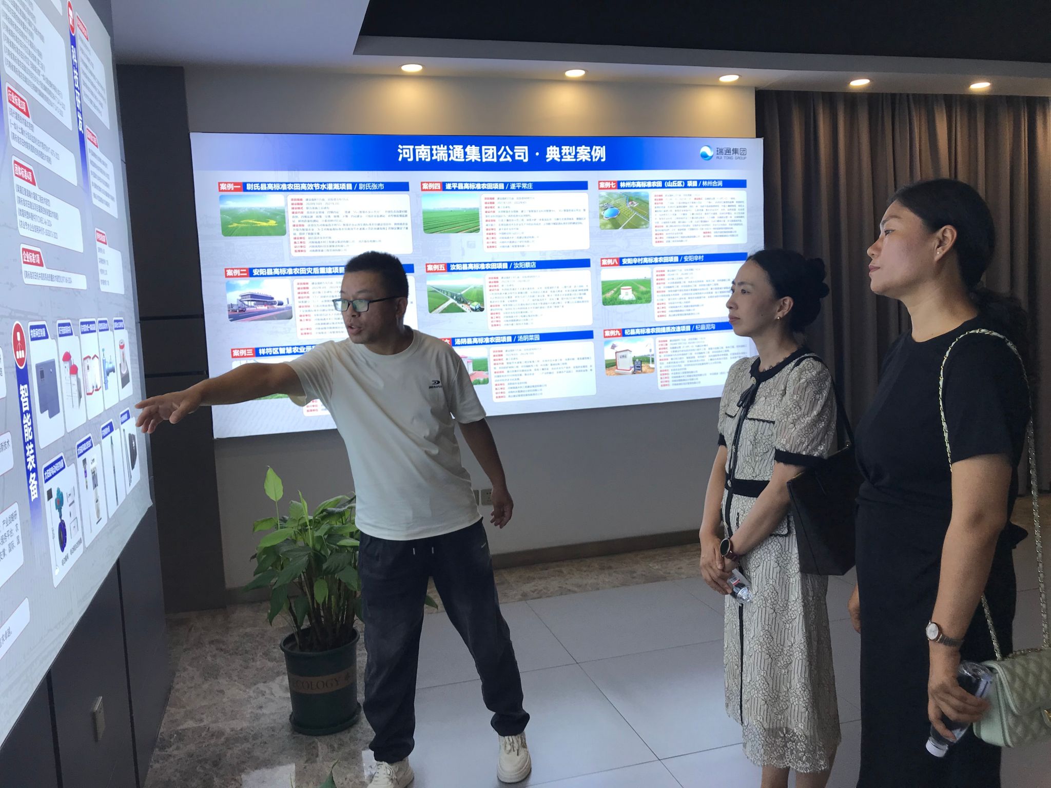 参观完企业后,学院一行人来到由瑞通集团参与建设的高标准项目示范区。该示范区以“智慧、绿色、高效”为建设理念,整合了物联网、云计算、人工智能等前沿技术。走进示范区,智能喷灌系统正根据土壤湿度传感器反馈的数据,精准调节喷水量;智能监测设备,在田间持续收集着光照、温度、风速等环境数据,并实时传输至农业数据中心。据示范区负责人介绍,通过高标准农田建设和智慧农业技术的应用,提升了农作物产量、水资源利用率,减少了农药和化肥的使用量,解放了劳动力,提高了生产力,实现了经济效益与生态效益的双丰收。学院一行三人深入田间地头,与技术人员交流,直观感受到了现代农业科技的魅力。