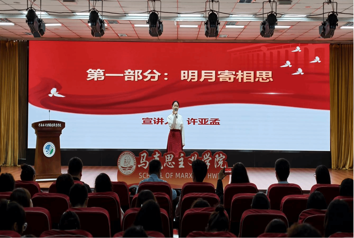 系列活动之一:“家国共团圆”思政宣讲快享会。许亚孟、张玉鑫、常娜三位思政课教师循着“明月寄相思—山河映风骨—青年当笃行”的逻辑脉络,依次登台分享:从古人“月满思亲”的家国共情,讲到历史长河中仁人志士的民族风骨,最终落脚于新时代青年“强国有我”的责任担当。三位教师深刻剖析了“家是最小国,国是千万家”的深层内涵,尤其是回顾了在河南波澜壮阔的抗战历史中,中原儿女前赴后继,开展了多种形式的抗日斗争,生动体现了伟大抗战精神,这是我们承前启后、继往开来创造新的历史的力量源泉。在场师生在历史与现实的碰撞中,对家国情怀有了更具象、更深刻的理解,也为在新时代新征程中团结奋斗、勇毅前行,谱写中原大地的崭新篇章,积蓄了强大的精神力量。